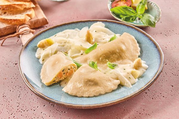 Verwöhnen Sie sich mit einer exquisiten Kreation aus der Köser-Küche: Lachs-Ravioli mit... mehr